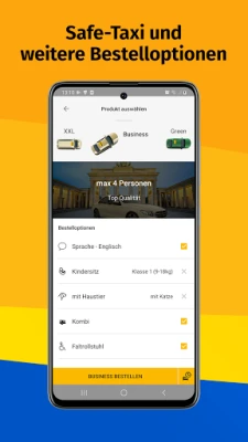 Prilagodite svaku vožnju svojim specifičnim potrebama uz Taxi-Berlin-App. Izaberite idealan tip vozila iz naše bogate ponude: od standardnog taksija za svakodnevne potrebe, preko Business-Taxi opcije za maksimalan komfor, Safe-Taxi-ja sa pregradom za dodatnu sigurnost, do prostranog XXL-Taxi-ja za grupe do osam osoba, ili ekološkog Green-Taxi-ja. Pored toga, nudimo i raznovrsne opcije opreme, uključujući dečja sedišta, pomoćne podizače i vozače sa znanjem stranih jezika. Putujete sa kućnim ljubimcem, kabastim prtljagom, sklopivim invalidskim kolicima ili dečjim kolicima? Kombi vozila su dostupna. A za potpuni komfor, vozač može zazvoniti na vašim vratima. Uživajte u jedinstvenoj usluzi kupovine u Berlinu, gde će naš vozač obaviti nabavku i dostavu umesto vas, čak i uz plaćanje unapred.